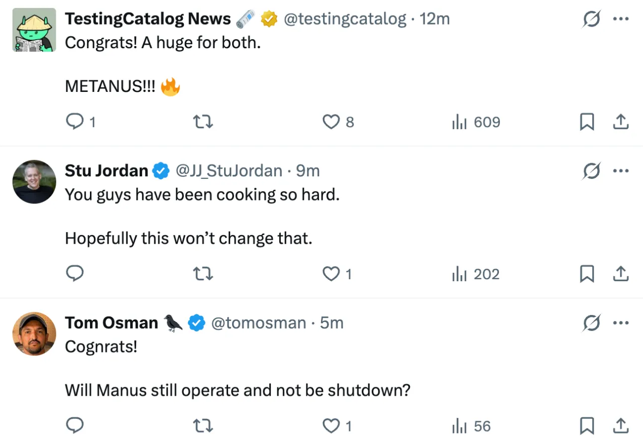 Meta's Chief AI Officer, Alexandr Wang, is excited to announce that Manus is joining Meta and helping us create amazing AI products! The Manus team is at the forefront of exploring the potential capabilities of current models and is committed to building powerful intelligent agents. ”It is not difficult to see from this statement that Meta attaches great importance to Manus, focusing on its leading technology and strong team in the field of intelligent agents.