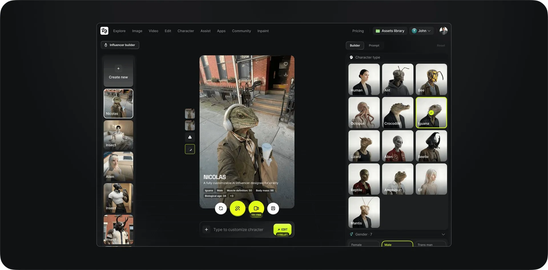 Influencer Studio is a character generator designed specifically for viral spread. It breaks the physical limitations of reality and allows creators to construct highly recognizable 'bizarre' characters.