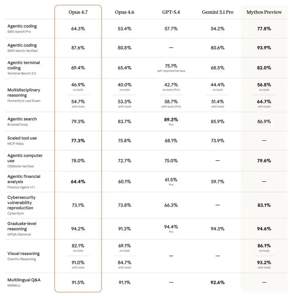 On the hardcore programming benchmark SWE bench Pro, Opus 4.7 jumped directly from 53.4% of the previous generation to 64.3%, with a single generation increase of nearly 11 percentage points.